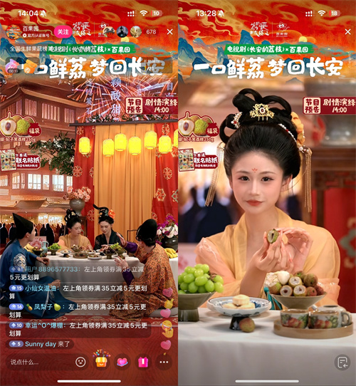 线上方面,5月29日,百果园在湖北经视抖音号率先开启了一场广东茂名荔枝产地溯源的直播,为直播间观众全面讲解了岭南荔枝的典故及特色。5月29日-31日期间,百果园抖音官方直播间紧跟热度,打出“一口鲜荔梦回长安”口号,以长安古风沉浸式带货 × 荔枝宴演绎直播风格,创造了直播曝光超6500万次的佳绩,在剧集播出前就实现高曝光、高转化,为后续话题热度持续上升奠定基础。