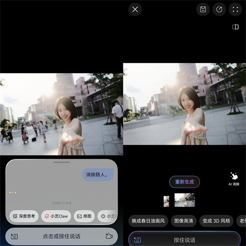 打开照片后,只需唤醒小艺说一句“帮我把后面的路人消除掉”,小艺便能精准识别路人进行消除,并自然补全背景。